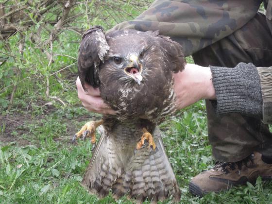 W dniu 09.04.2016 hodowca gołębi z miejscowości Zalesie gm. Ryki przywiózł do podleśniczego Dariusza Piechoty z leśnictwa Stawy rannego myszołowa, którego znalazł w lesie.